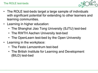 The document summarizes various test-beds for the ROLE project, which aims to extend learning tools and make them more personalized. It describes test-beds in higher education including at Shanghai Jiao Tong University and RWTH Aachen University, as well as in workplaces like Festo and the British Institute for Learning and Development. Each test-bed section outlines the context and goals and describes relevant widgets or tools developed by the ROLE project to enhance and personalize the learning experience. The document also discusses OpenLearn as a test-bed and how ROLE widgets could support learner-centric and social aspects of learning within the OpenLearn platform.
