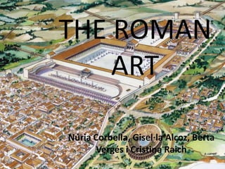 The Romanesque art document discusses Roman art from ancient Rome and the Roman Empire between the 3rd century BC to the 5th century AD. It was divided into Republican art with Greek influence and Imperial art from the 1st century BC to the 5rd century AD. Major Romanesque art forms included architecture, painting, sculpture and mosaics. Roman victory over Greece in 146 BC spread Roman artistic styles. Painting is considered the most important part of Romanesque art, though much is only known from artifacts preserved at Pompeii and Herculaneum after the volcanic eruptions. Other discussed Roman constructions included aqueducts, amphitheaters, circuses, castles and walls.