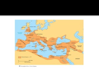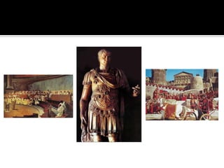 The Roman Civilization document provides an overview of the origins and development of ancient Rome from its founding by Romulus and Remus through the transition from republic to empire. It describes Rome's strategic location and fertile soil which allowed it to develop. It then discusses the early republic and the social divisions between patricians and plebeians. Finally, it outlines the Roman system of government including the executive, legislative, and judicial branches and how the republic eventually transitioned to an empire under Julius Caesar and Augustus.