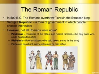 The Roman Republic was established in 509 B.C. after the overthrow of the Etruscan king Tarquin, featuring a government where citizens elected rulers, though patricians held significant power over plebeians. Rome expanded its territory through military conquests, defeating rivals such as Carthage in the Punic Wars, which transformed it into a dominant Mediterranean power but also led to economic and social disparities. Key figures like Julius Caesar emerged during a time of political strife, ultimately leading to the end of the Republic and the rise of the Roman Empire under Octavian in 31 B.C.