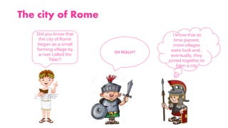 The document presents the origins of Rome, highlighting that it started as a farming village and was founded by Romulus after a violent conflict with his twin brother Remus. Rome transitioned from being ruled by kings to becoming a republic. The presentation concludes with an interactive question about the audience's enjoyment of the material.