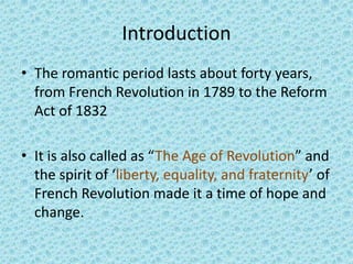 The Romantic Age lasted from 1789 to 1832, a period of revolution and social/political upheaval in Europe following the French Revolution. Poets like William Wordsworth expressed hope for change, though the Reign of Terror and ensuing wars dampened optimism. Society industrialized rapidly, creating conflicts between social classes. Romantic literature focused on emotion and imagination rather than reason, as seen in William Blake's symbolic poems from Songs of Innocence and Experience. A few British poets like Blake changed English literature fundamentally by introducing this new Romantic spirit.