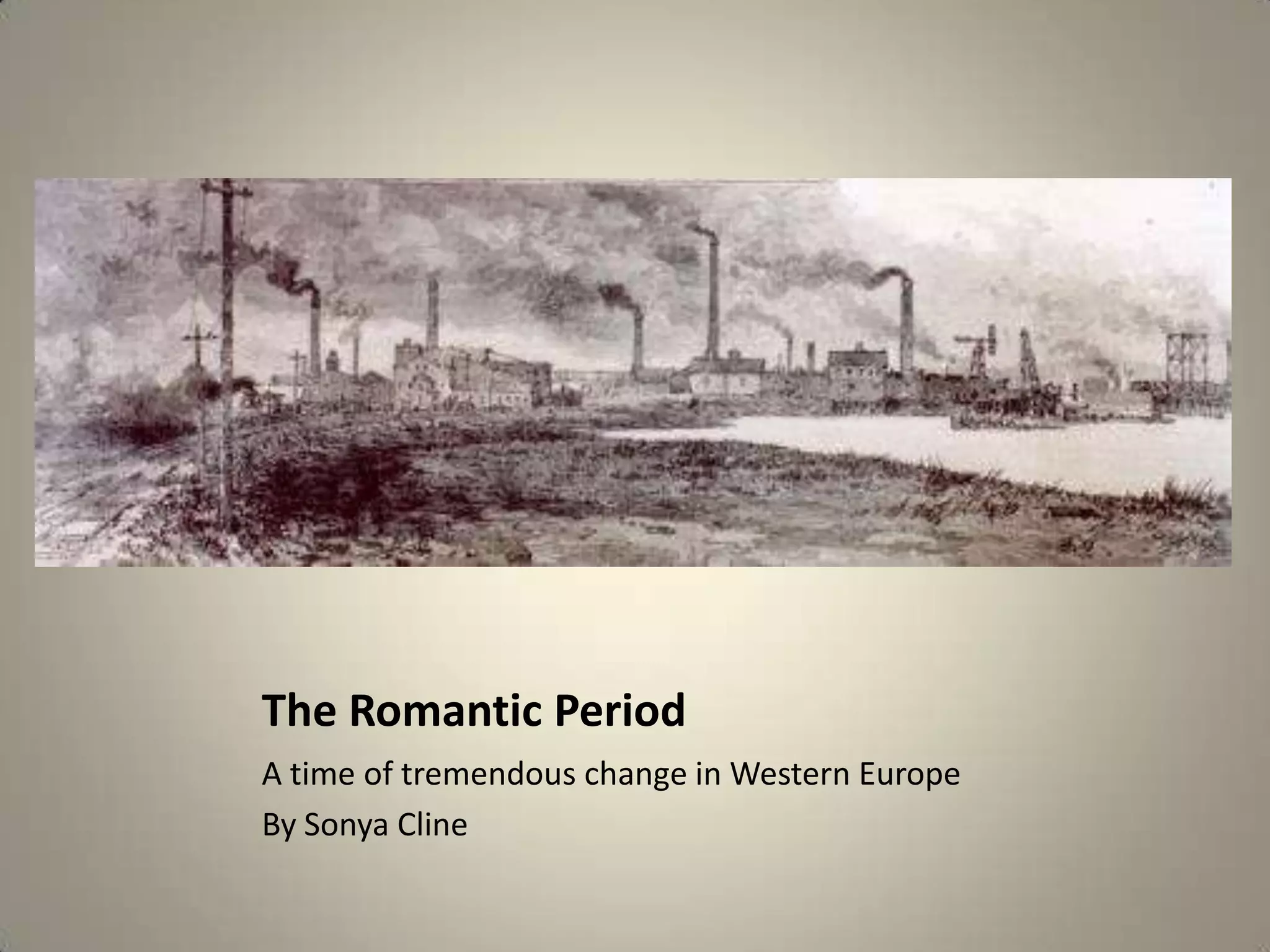 The Romantic Period was a reaction against the Enlightenment and rational thinking. It valued emotion, individualism, and nature. Major events like the Industrial Revolution, revolutions in America and France, and Napoleonic Wars led to social upheaval and inspired Romantic works addressing these themes. Key writers included William Blake, Samuel Taylor Coleridge, Mary Shelley, Percy Bysshe Shelley, and Lord Byron, who produced poetry and fiction praising imagination, emotion, and nature while critiquing the social impacts of the era.