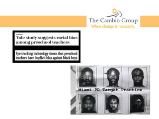 The document discusses the need to address racial inequities in education directly rather than avoiding the root causes. It presents statistics showing disparities between black and white students in areas like suspension rates, test scores, graduation rates, and poverty levels. The document argues that the purpose of education needs to shift from a focus on global competitiveness to providing students with skills to question assumptions and intervene to create a more just world. It advocates for teacher preparation, curriculum, and school design that incorporates social-emotional learning, culturally responsive teaching, historical literacy, and project-based learning to transform education outcomes for students.
