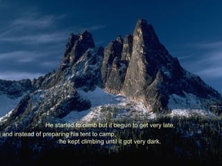 The document summarizes a story about a mountain climber who wanted to climb the highest mountain alone. As he neared the top at nightfall, he slipped and fell into the air. Hanging by his rope, he cried out to God for help. A voice from above told him to cut the rope, but he held on for dear life. The next day rescue workers found his body just 10 feet from the ground, frozen and still clutching the rope. The document encourages the reader not to doubt God or feel abandoned, as he is always holding us with his right hand.