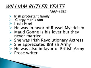 This document summarizes William Butler Yeats' poem "The Rose Tree" and its themes. It notes that Yeats was an Irish poet from a Protestant family whose lover Maud Gonne supported the British Army. The poem uses symbols like a rose tree and bitter sea to depict a conversation where two people discuss how political efforts have failed and the world has lost importance unless watered by nationalism, with the garden serving as a metaphor for the world. It ultimately argues the poem aims to advocate for Irish independence through depicting the Irish movement.