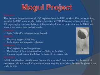 This document discusses and compares three theories about the UFO incident that occurred in Roswell, New Mexico in 1947: