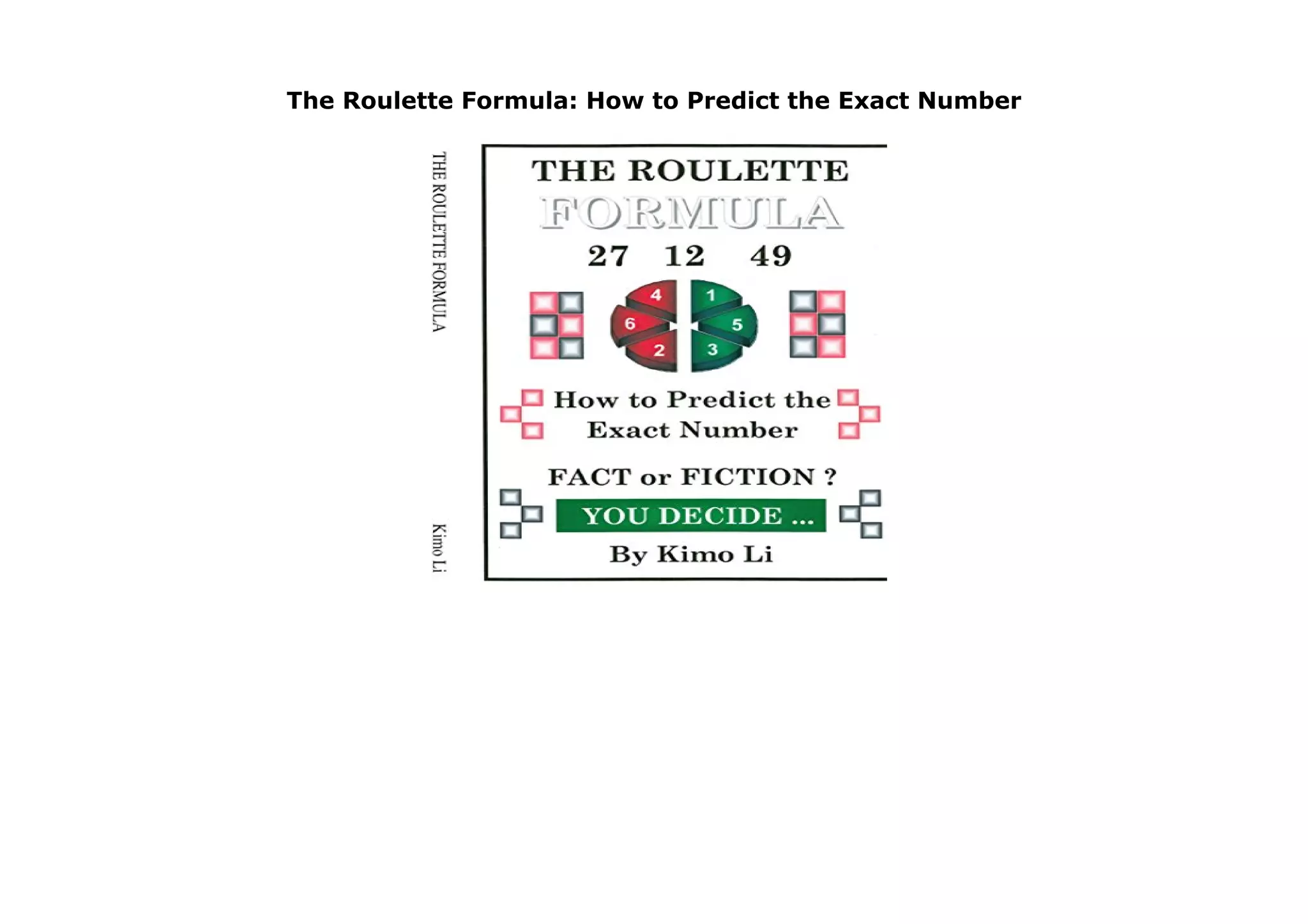 This 152-page book by Kimo Li claims to reveal a formula for predicting the exact number that will land on a roulette wheel. The book provides details about the author, publisher, year of publication, language, and ISBN numbers. It appears to promise a method for cracking the roulette game through mathematical formulas.