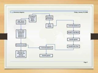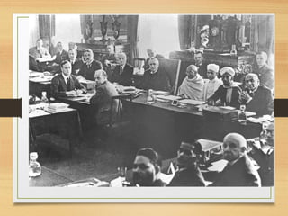 The Round Table Conferences from 1930-1932 aimed to settle India's constitutional future but achieved little consensus. The Gandhi-Irwin Pact of 1931 saw Gandhi agree to suspend civil disobedience in exchange for prisoner releases. However, Gandhi's claims at the second conference that Congress alone represented India irritated other representatives. The conferences ended without agreement, disappointing Gandhi and leaving Britain firmly in control of India.