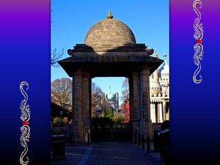 The Royal Pavilion in Brighton, England was built beginning in 1787 as a seaside retreat for the Prince of Wales, who later became the Prince Regent. Over 35 years it grew from a simple farmhouse into an ornate oriental palace in the Indo-Saracenic style popular in India during the 19th century, featuring some of the most extravagant Chinese-inspired interiors in Britain. During World War I it was temporarily converted into a hospital for Indian soldiers wounded while fighting for British forces.