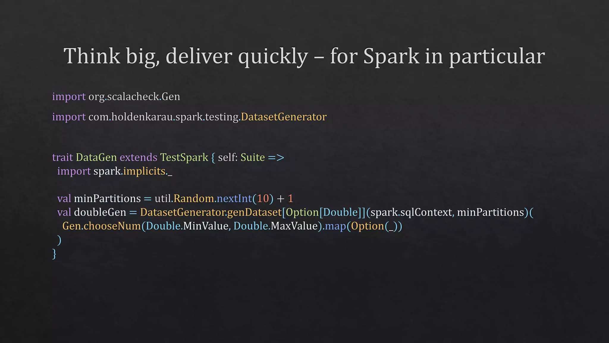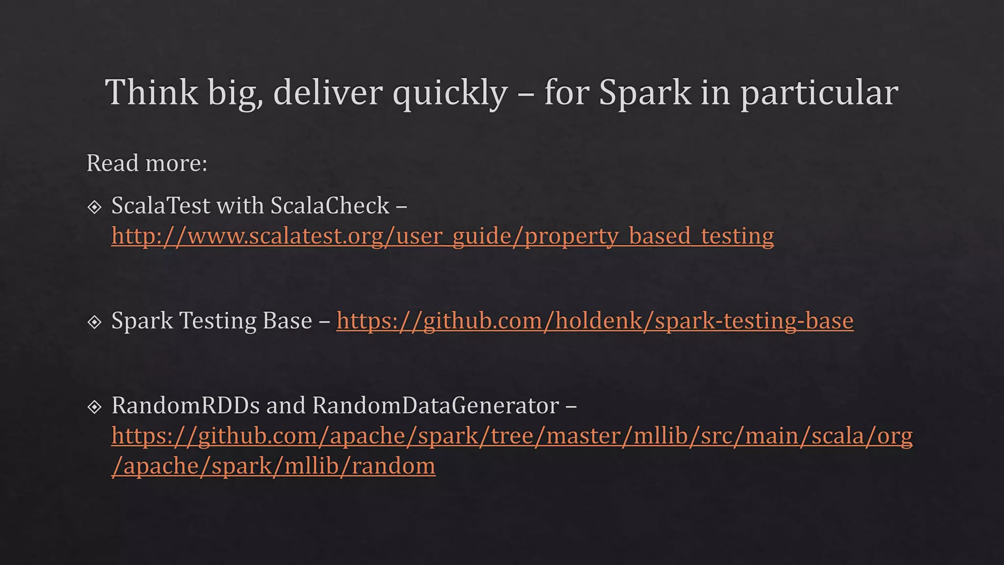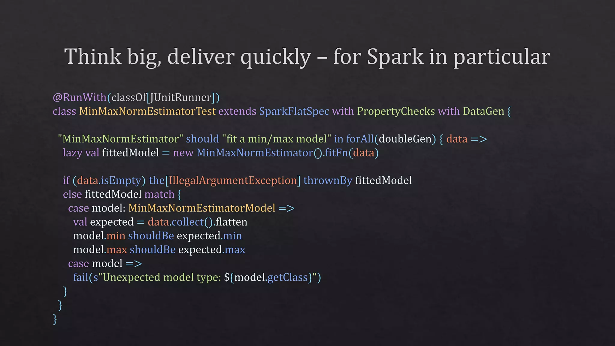 The document describes a MinMax normalization estimator and its model in a Spark environment, detailing the transformation process for data normalization. It includes class definitions, methods for fitting the model, and test specifications using JUnit for verifying the functionality of the estimator. Additionally, it references links to external resources for further information on Spark's capabilities and best practices.