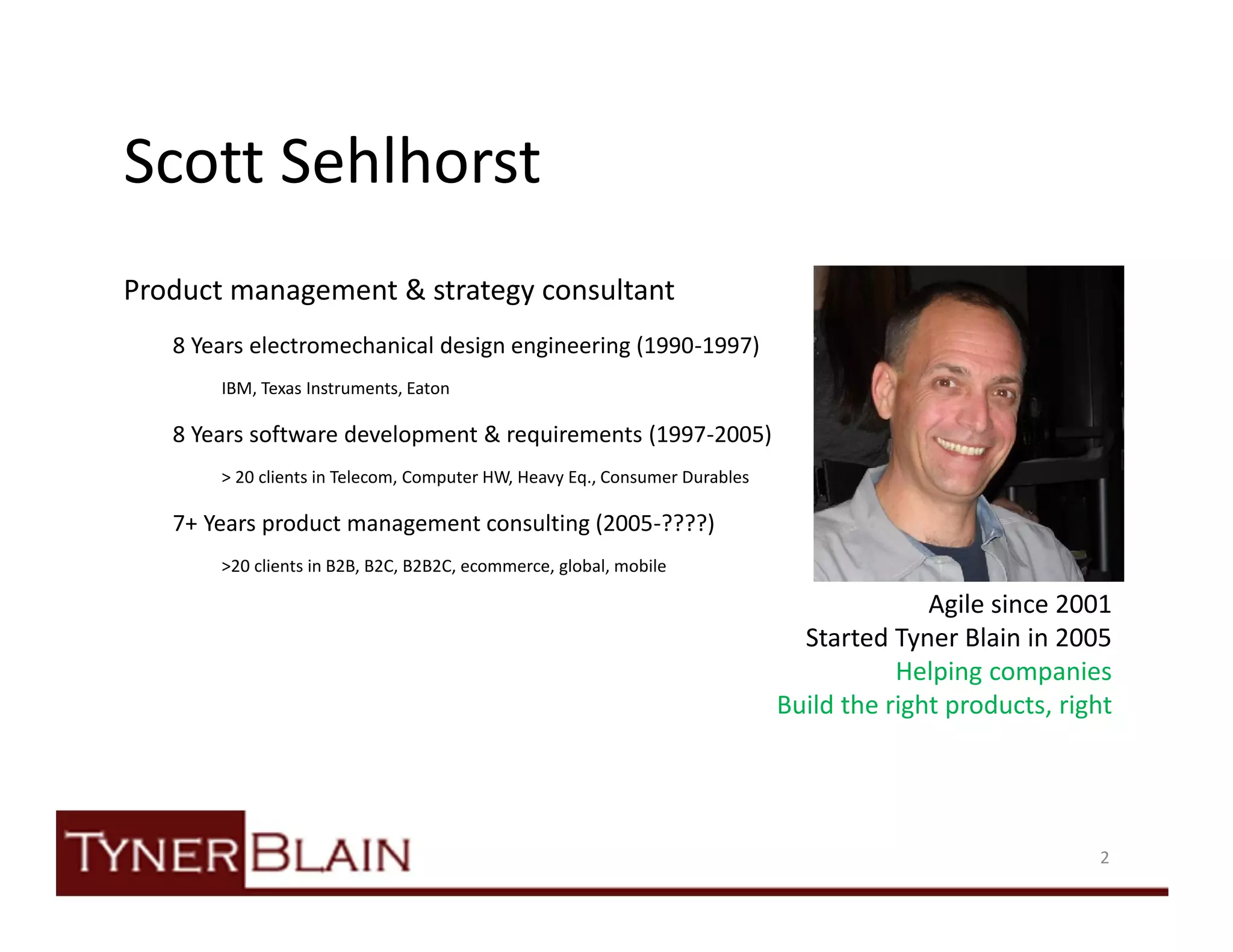 The document outlines essential rules for writing effective product requirements to ensure business success, emphasizing the importance of user input, clarity, and measurability. Key characteristics of robust requirements include being valuable, concise, unambiguous, verifiable, and consistent. Scott Sehlhorst, the author, draws on his extensive experience in product management and engineering to provide guidance aimed at helping organizations build the right products.