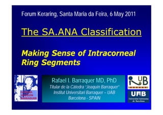 The document discusses the evolution and effectiveness of intracorneal segments (ICS) for treating keratoconus and other ectatic conditions, noting initial uses for mild myopia. It summarizes various studies highlighting improvements in uncorrected and best-corrected visual acuity, as well as reductions in spherical equivalent and topographic values. Concerns about variable results, safety issues, and the need for better understanding and refinement of procedures and nomograms are also addressed.