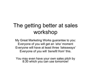 The document details a sales workshop focused on improving participants' skills in selling by emphasizing rapport-building, understanding different types of selling (B2C, B2B, B2G), and employing effective communication strategies. Key elements of sales include structure, objection handling, and the importance of creating positive interactions with clients. The workshop aims to provide actionable strategies for closing deals and enhancing sales effectiveness through various techniques and mindsets.