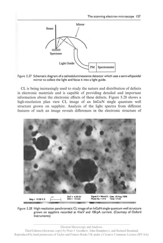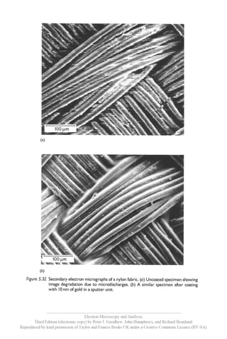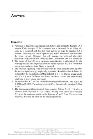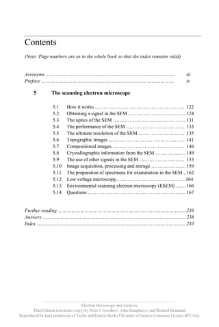 This document is an index for the book 'Electron Microscopy and Analysis, Third Edition' by Goodhew, Humphreys, and Beanland. It covers various topics related to scanning electron microscopy, such as its workings, signal acquisition, image processing, and specimen preparation. Additionally, it provides sections for further reading, answers to questions, and an index.