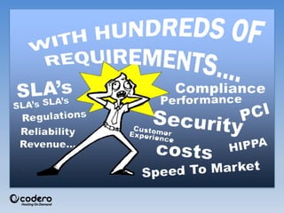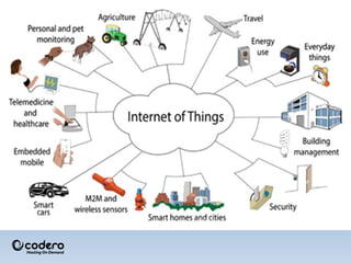 The document discusses the Internet of Things (IoT), its projected growth, and the resulting demand for big data storage solutions. Key applications of IoT include smart manufacturing, home automation, smart cities, autonomous vehicles, wearables, and healthcare, each with unique data challenges. Codero Hosting aims to offer hybrid cloud solutions that enhance flexibility, reduce costs, and improve scalability for managing IoT data.