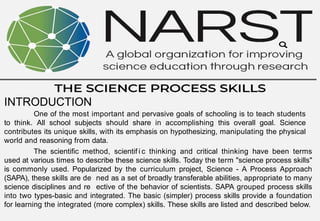The document emphasizes the importance of teaching science process skills to enhance students' thinking abilities. It defines these skills as transferable and grouped into basic (e.g., observing, inferring) and integrated (e.g., experimenting, interpreting data) categories. The National Science Teachers Association suggests that a significant portion of the science curriculum should focus on these skills for effective learning.