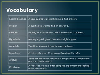 Scientific Method Astep-by-step way scientists use to find answers.