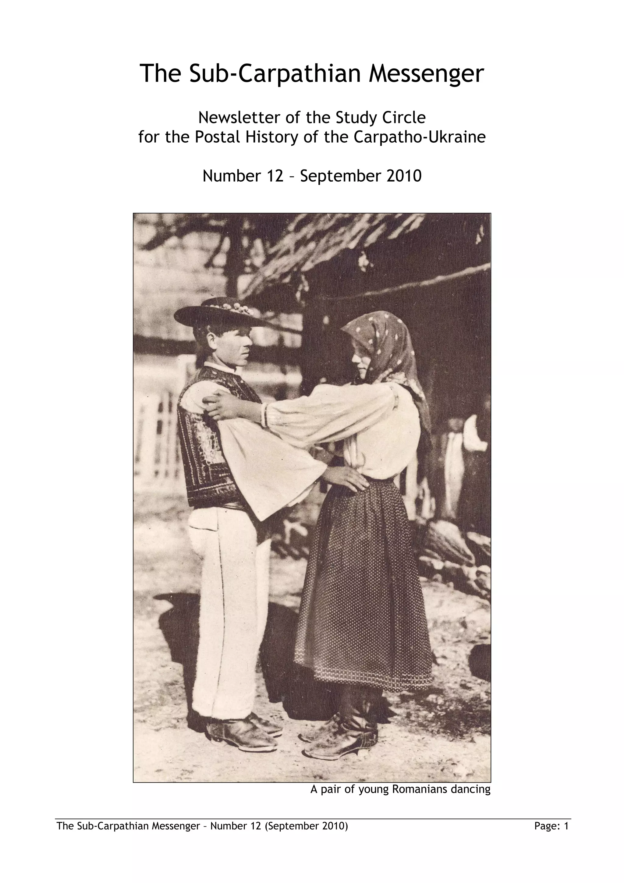 This document provides information about the Study Circle for the Postal History of Carpatho-Ukraine and their newsletter. It discusses the distribution method changing to an online archive and encourages contributions from readers. It also outlines some basic rules and regulations for the newsletter. Several subsequent sections provide historical postal route information and details on postmarks from the region.