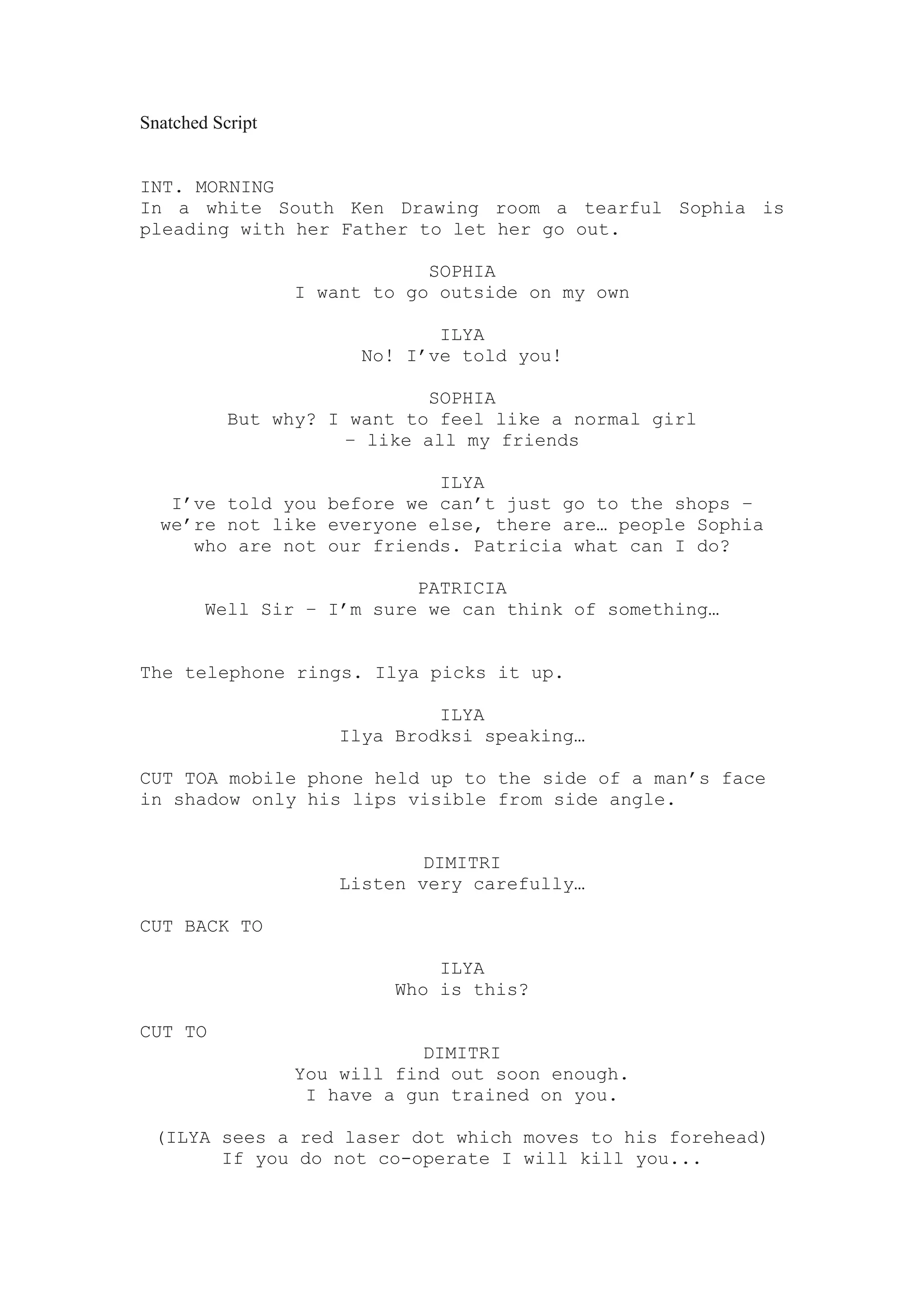 A man named Ilya is keeping his daughter Sophia confined at home for her safety. When Sophia pleads to go out, they receive a threatening phone call from a man named Dimitri who has them under surveillance. Dimitri demands Ilya's cooperation. Ilya sends Sophia away with their driver and caretaker Patricia, believing she will keep Sophia safe. However, Patricia texts Dimitri that she has Sophia and will also get Ilya, revealing she is working with Dimitri. Sophia realizes this and screams for her father as Patricia smiles evilly, having kidnapped Sophia as part of the plan.