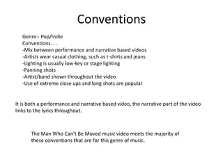 This document discusses the conventions of pop/indie music videos and analyzes how the music video for "The Man Who Can't Be Moved" meets many of these conventions. It summarizes that the video has both a performance and narrative element that links to the lyrics. It also notes that the band is shown throughout in casual clothing with natural lighting. Location changes between the street and parking lot are connected through editing.