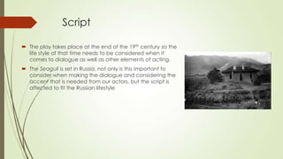 This document provides details on casting and directing choices for a production of Anton Chekhov's play "The Seagull". It suggests casting Zooey Deschanel as Masha, Joseph Gordon-Levitt as Medvedenko, Richard Griffiths as Sorin, and Ben Whishaw as Treplieff. It also discusses casting choices for other roles and includes photos of suggested actors. The document outlines that the play will take a realistic style and will focus on the conflicting desires of love, success, and family in a rotating way showing different character's perspectives. Sound and a slow pace will be used to enhance the sad mood of the production.