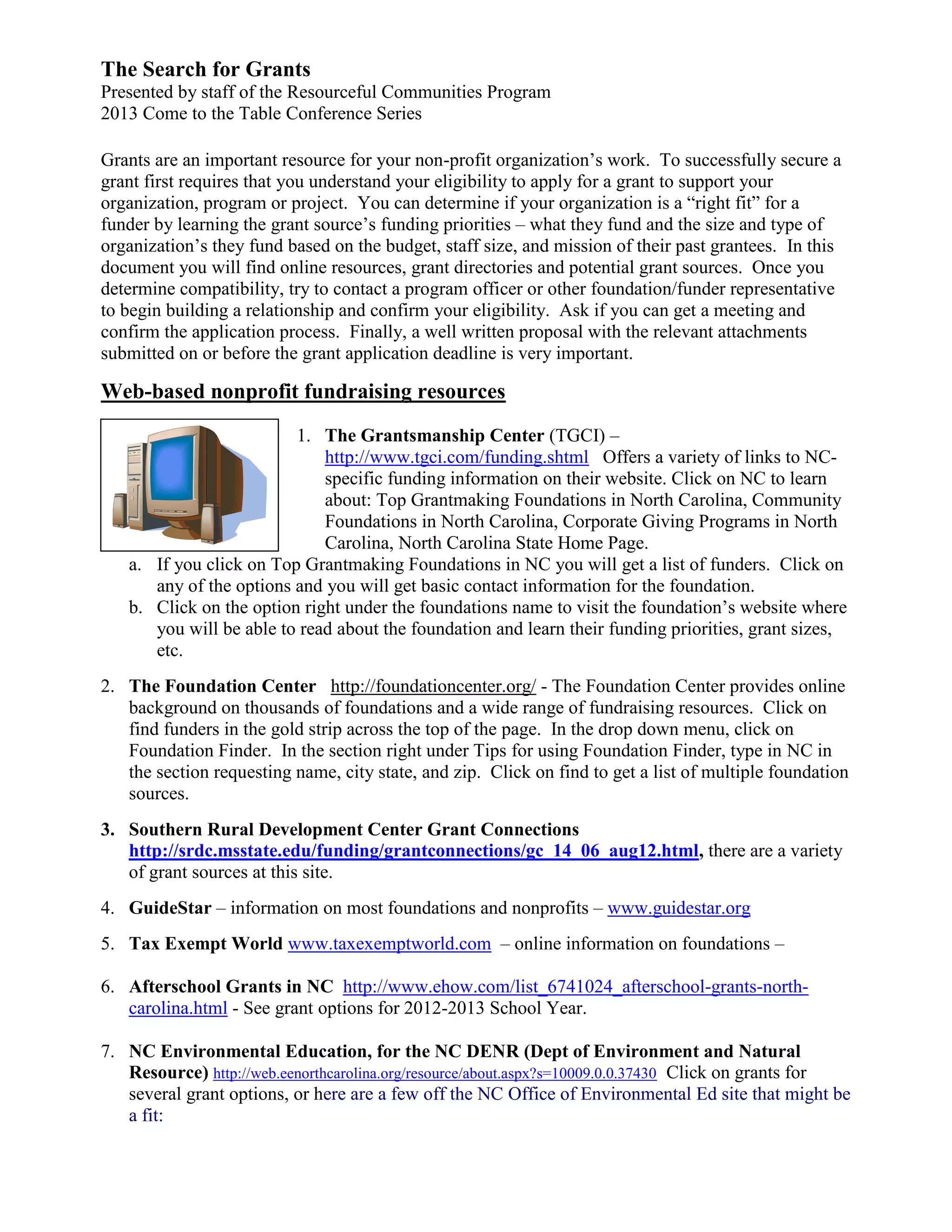 This document provides resources for non-profits to search for grant opportunities, including online directories of foundations and grants, as well as some potential grant sources. It recommends first understanding your organization's eligibility and the funder's priorities. Then it lists several online databases of foundations and grants, including some focused on North Carolina. It also provides some examples of specific grant opportunities. Finally, it offers additional fundraising resources beyond just grants.