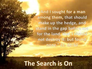 The Lord is still looking for men to stand in the Gap and build up the Hedge. Ezekiel 22:23-31
