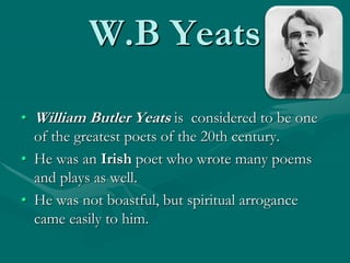 The document discusses William Butler Yeats, one of the 20th century's greatest poets, focusing on his poem 'The Second Coming' written in 1919 amidst the turmoil following World War I and the Irish War of Independence. The poem features powerful imagery and symbolism, depicting a world in disorder and foreseeing a dark new era as symbolized by a beast emerging from chaos, contrasting traditional Christian beliefs. It explores themes of loss, change, and the disintegration of values, suggesting that out of chaos arises something darker and more malevolent.
