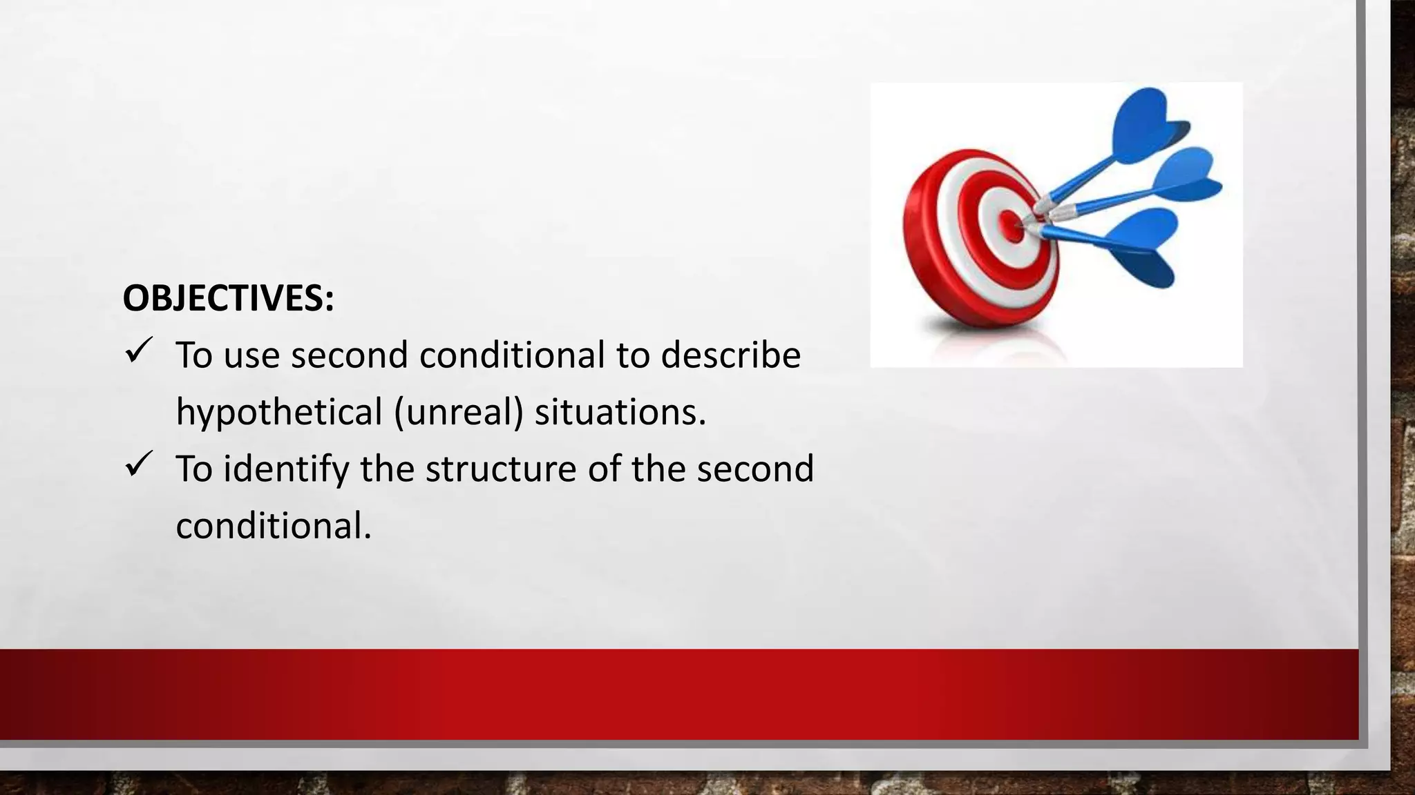 This document discusses the structure and use of the second conditional to describe hypothetical or unlikely situations. It begins by explaining that the second conditional uses past tense verbs to talk about possible present or future situations that are not real. It then provides examples of the typical "if-clause + would-clause" structure. The document outlines the specific verb tenses and forms used in the if-clause and would-clause of the second conditional construction. It also compares the second conditional to the first conditional and discusses how certain modal verbs like "might" and "could" can be used instead of "would" to express uncertainty.