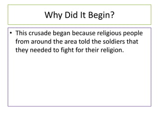 The Second Crusade was fought between France and Germany against the Turks from 1147-1149 over possession of the Holy Land and Jerusalem. It began as religious leaders called for soldiers to fight for their religion and ended when attacks on Damascus failed to accomplish their goals, though it inspired Columbus's voyage and increased funds for the church.