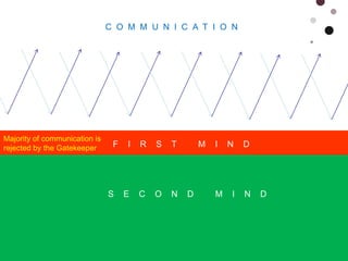 The document contrasts the conscious first mind with the subconscious second mind. It notes that the second mind defines 90% of buying behavior while the first mind only defines 10%. It also states that the majority of communication is rejected by the first mind's gatekeeper function, so brands must bypass this and resonate with consumers' subconscious perceptions. Finally, it introduces the concept of a brand's "hotspot" in the second mind that can help with strategizing around many business and branding areas.