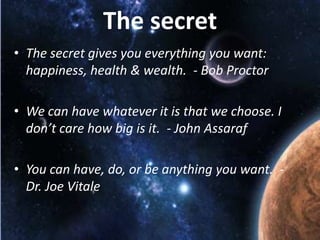 The document summarizes "The Secret" which discusses the law of attraction. It states that your thoughts become things and that you can have anything you want through focusing your thoughts on prosperity, health, wealth, and abundance. It provides steps to use the law of attraction including asking for what you want, believing you will receive it, and giving thanks.
