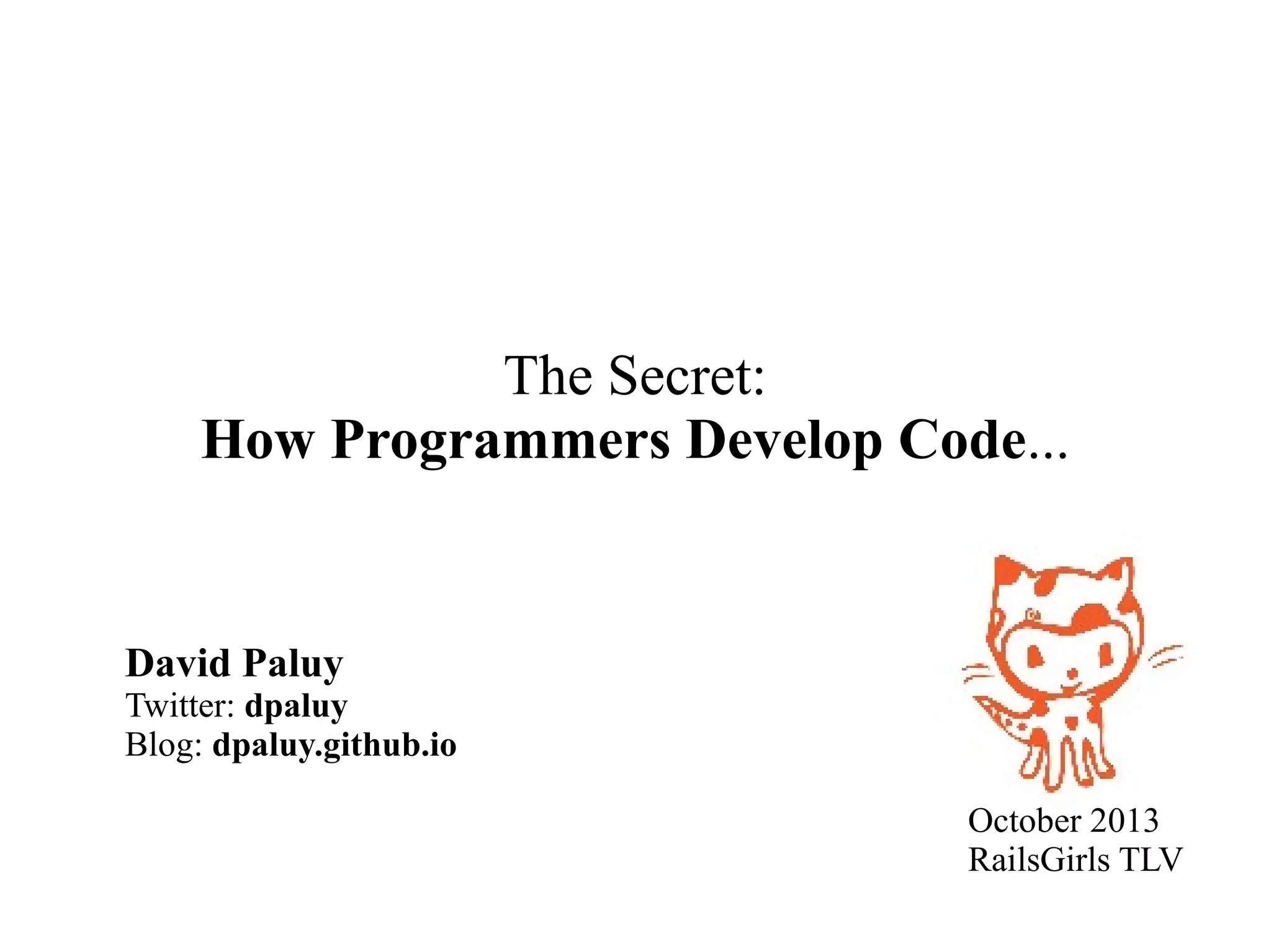 Programmers develop code by searching for solutions online, asking questions on forums like StackOverflow, and checking forums for answers. They may search Google, ask questions on StackOverflow providing their Rails version and issue details, and check the question's date and score to evaluate answers. Forums allow programmers to ask questions so others facing similar issues can find responses.