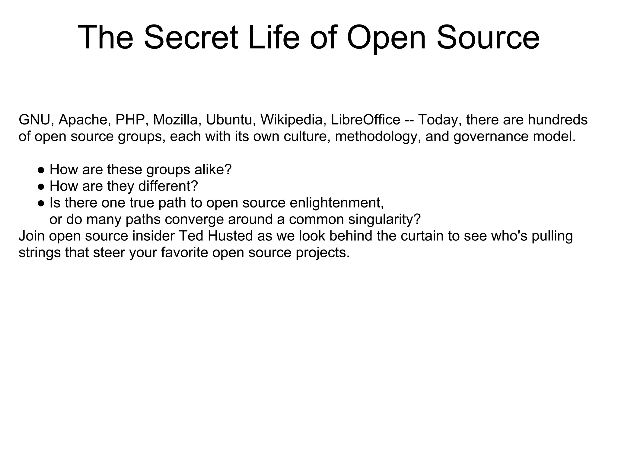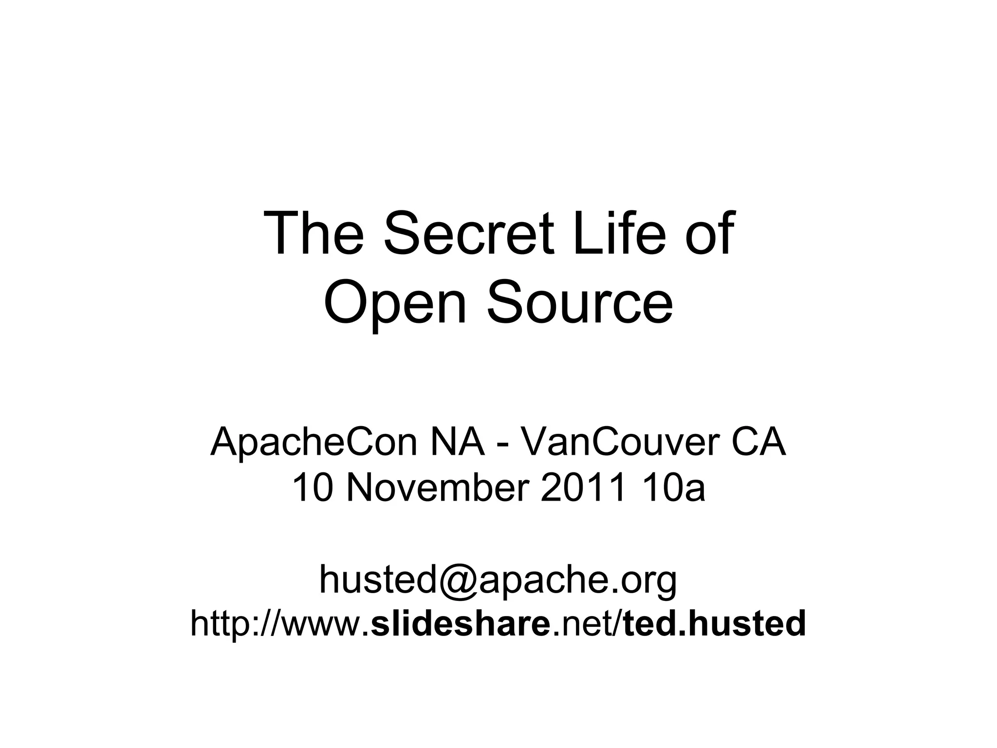 This document summarizes Ted Husted's presentation "The Secret Life of Open Source" given at ApacheCon NA in Vancouver, CA on November 10, 2011. It discusses the history and evolution of major open source projects from the 1960s to present day including GNU, Linux, Apache, PHP, Mozilla, Ubuntu, Wikipedia and LibreOffice. It also examines the different governance models and growth of open source usage in commercial products and organizations. The presentation explores how open source communities balance code, community and conscience in their operations.
