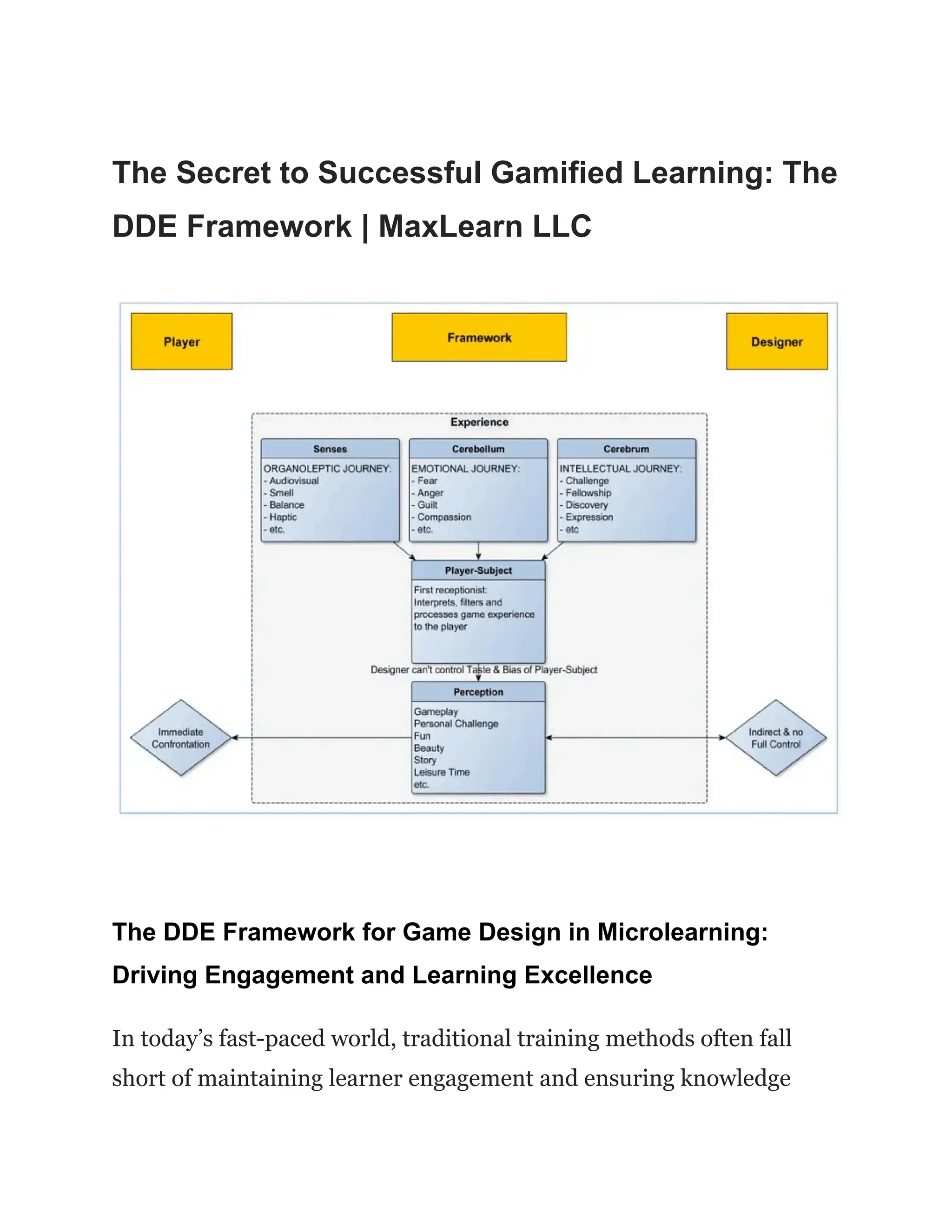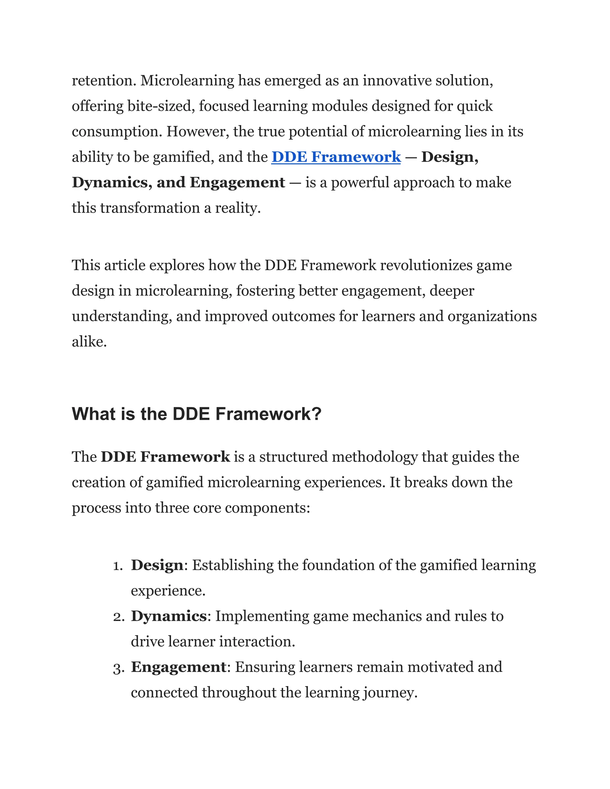 The DDE framework (Design, Dynamics, Engagement) provides a structured approach to gamified microlearning, enhancing learner engagement and knowledge retention. It comprises three components: design for aligning game elements with learning objectives, dynamics for implementing interactive game mechanics, and engagement for maintaining learner motivation. This methodology offers various benefits, including improved performance, scalability of training programs, and cost-effectiveness across different industries.