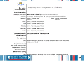 This document provides an overview of the selection process used by the consulting firm Search & Selection. It describes the various stages of selection including analyzing job applications, screening CVs, conducting interviews using different structured techniques, administering psychometric tests and simulations, and providing an assessment center for managerial roles. Tips are provided for candidates on writing effective CVs, cover letters, and preparing for interviews and assessments. Contact information is included for consultants at the firm.