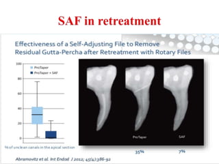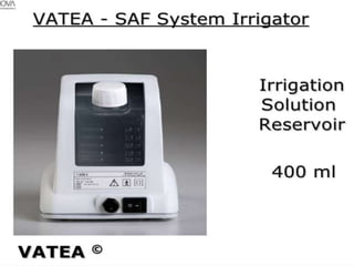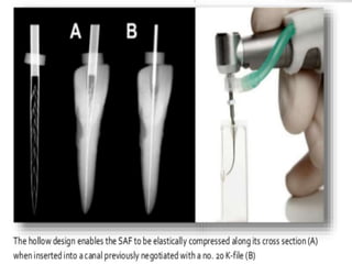 The document discusses the advancements in endodontic treatments using rotary nickel titanium and introduces the SAF (Single-file Adaptive) system, designed to enhance cleaning and shaping of root canals, particularly oval ones. The SAF employs a hollow compressible Niti file that minimizes unnecessary dentin removal while ensuring effective disinfection and obturation. The system includes specific devices for irrigation and operation, providing economic advantages and improved clinical outcomes in dental procedures.