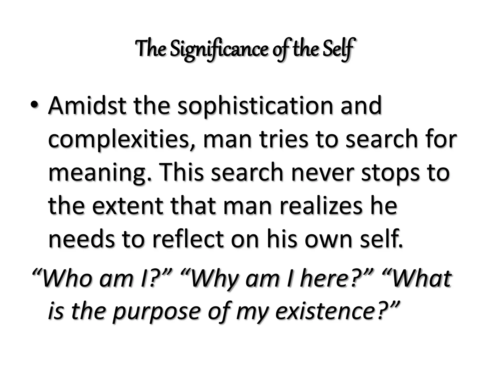 The document explores the concept of self, emphasizing the importance of understanding one's identity through the interplay of heredity, environment, and social interactions. It details the characteristics and development of the self, highlighting the transformative processes of self-concept, self-esteem, and authenticity. Additionally, it discusses various psychological mechanisms for self-adjustment and personal growth, reflecting on how these contribute to an individual's sense of meaning and value in life.