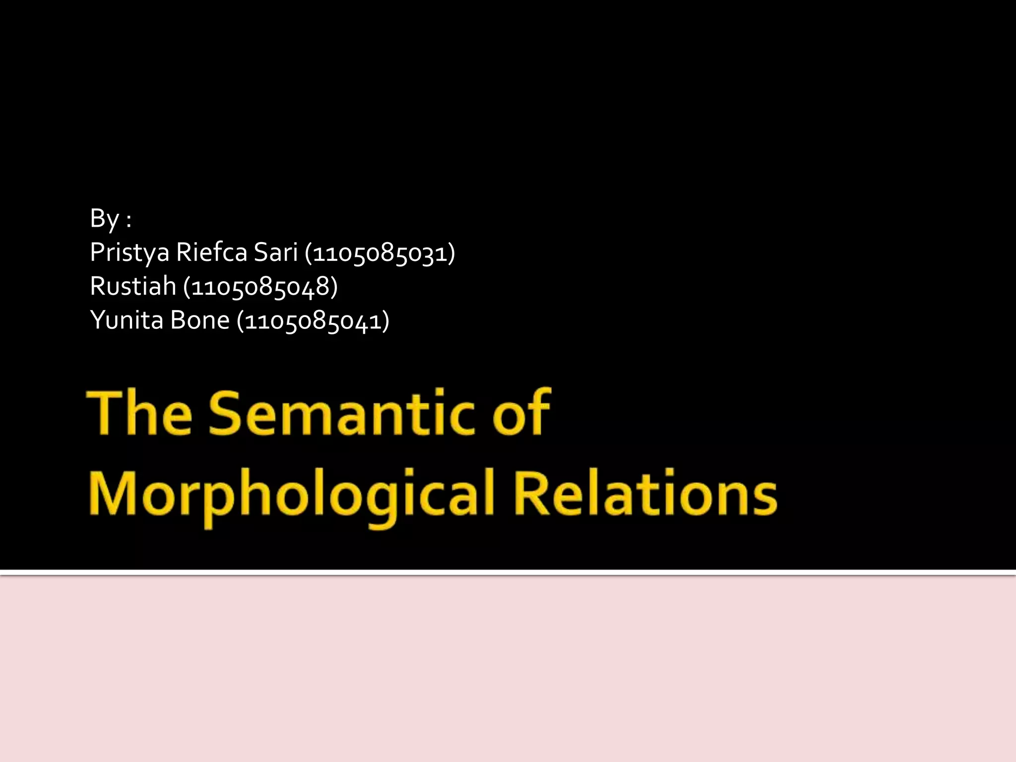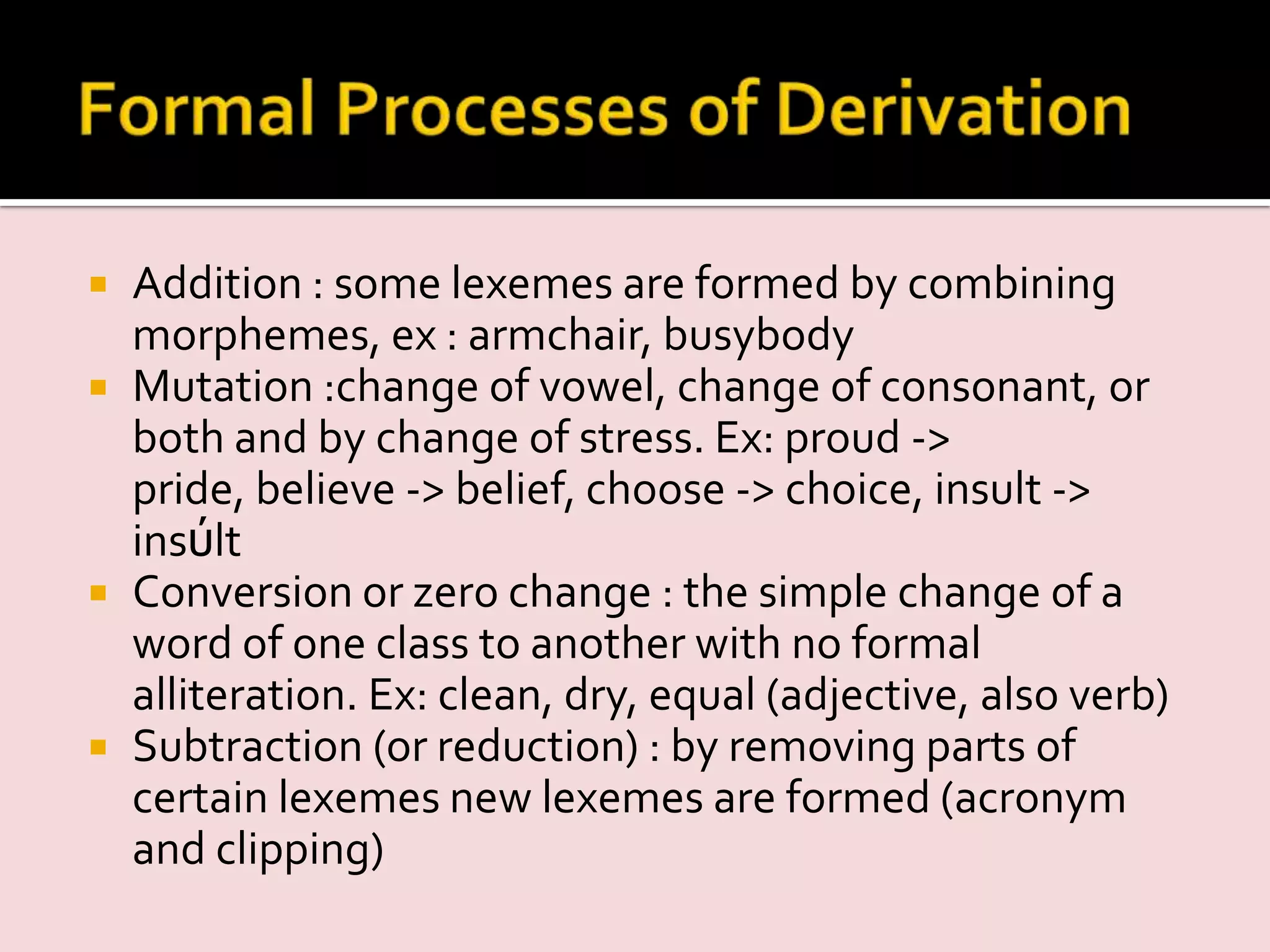 This document discusses various morphological processes in word formation including addition, mutation, conversion, subtraction, and their effects on word class. It provides examples of how nouns, verbs, and adjectives are derived from each other through conversion or changes in meaning. Specific affixation processes are also described such as causative, inchoative, repetitive, and reversive prefixes. The effects of affixes like -ish, -less, and -ful on adjectives are explained. Finally, different types of derived nouns are defined such as action nouns, effect nouns, and place nouns.