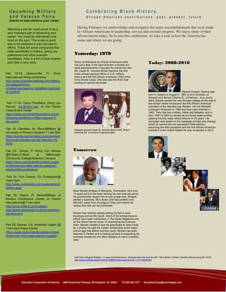 This newsletter provides information for military members and veterans. It discusses upcoming job fairs and military discounts for Valentine's Day. It also highlights African American history figures and profiles a young entrepreneur. Additionally, it lists several scholarship opportunities for military connected students.