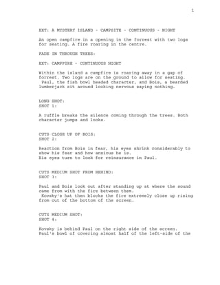 The Shady Bunch script follows three characters - Paul, Bois, and Kovsky - around a campfire on a mysterious island at night. After hearing a strange noise, Kovsky returns with berries which he feeds to the group. Bois and Kovsky then have bizarre hallucinations involving melting faces and inflatable arm men. The next morning, Kovsky wakes up from a dream only to discover that the events of the previous night, including the appearance of fire people making love in the distance, were real. He eats the remaining berries in shock.