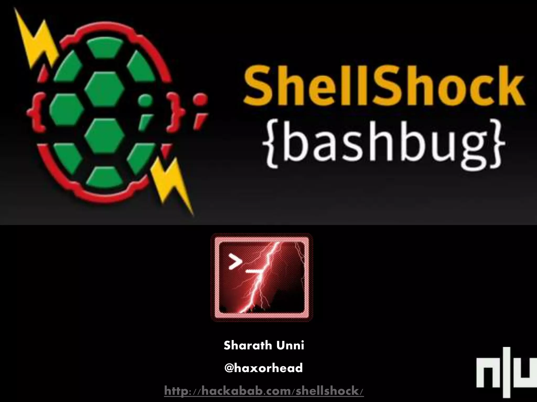 This document summarizes the Shellshock bug in Bash software discovered in September 2014. It describes four vulnerabilities (CVE-2014-6271, CVE-2014-6277, CVE-2014-7169, and an unknown CVE) that could allow remote code execution by manipulating environment variables passed to Bash. The document also outlines potential attack scenarios like reverse shells, data theft, and click fraud that could exploit Shellshock. It concludes by mentioning Patch 27 and a script to fix the vulnerable Bash versions.