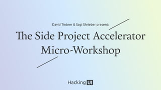 The Side Project Accelerator workshop by David Tintner and Sagi Shrieber emphasizes the importance of building personal dreams rather than working on others'. It encourages participants to adopt an audience-driven approach, remain authentic, and consistently get their work in front of others while setting clear expectations. The content includes exercises for discovering passions and structuring writing, all aimed at achieving freedom and thought leadership in one's side projects.
