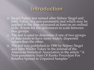The Siegel-Tukey test, introduced by Sidney Siegel and John Tukey in 1980, is a non-parametric statistical method used to compare the spread of two independent groups measured at least on an ordinal scale. It involves calculating rank sums, evaluating the null hypothesis of equal variances, and determines acceptance or rejection based on calculated versus critical values. The document provides detailed procedures and examples, demonstrating how to apply the test to datasets with breaking loads of two types of plastics.