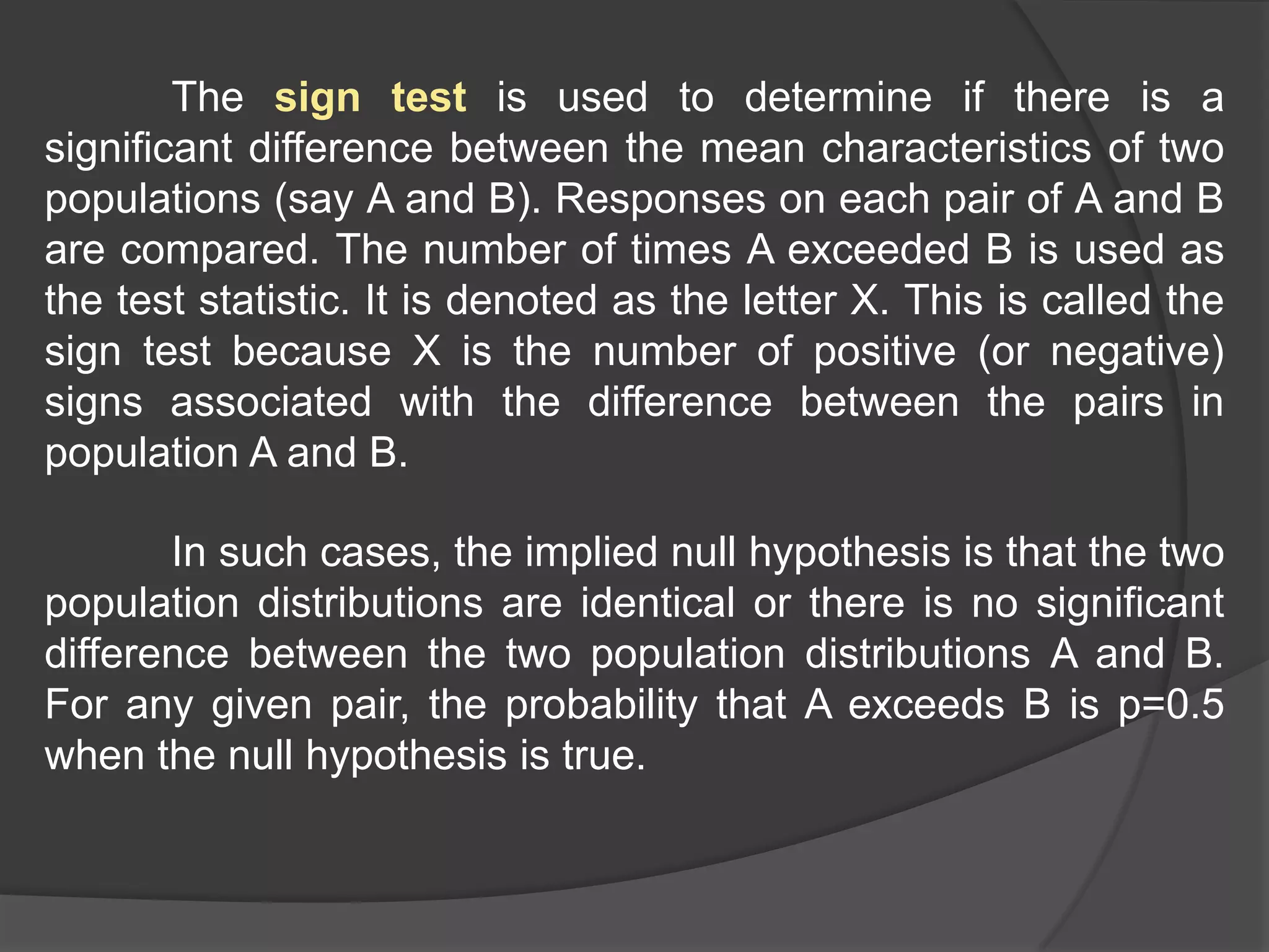 The sign test is used to compare two populations (A and B) by examining pairs of observations from each population. The number of times population A exceeds population B (X) is the test statistic. Under the null hypothesis, the two populations are identical and the probability of A exceeding B is 0.5.
