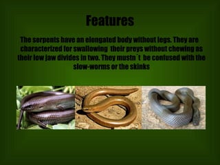 Snakes are elongated, legless reptiles that swallow their prey whole due to their bifurcated lower jaws. There are four main types of snakes: cobras, mambas, and coral snakes; pythons and boas; and vipers and rattlesnakes. Snakes kill either through venom injected via fangs or by constriction using their powerful muscles to asphyxiate prey. Cobras have extremely dangerous venom and will spit and extend their hoods when threatened, while anacondas use constriction to kill large prey by biting and coiling until the prey asphyxiates.