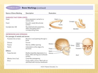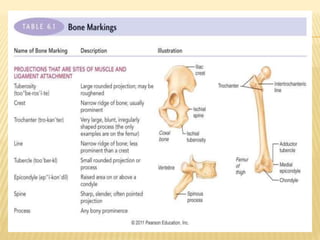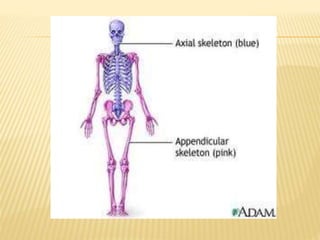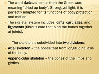 The skeletal system includes bones, joints, cartilages, and ligaments. It is subdivided into the axial skeleton which forms the longitudinal axis of the body, and the appendicular skeleton which includes the bones of the limbs and girdles. Bones have several functions including support, protection, movement, storage, and blood cell formation. There are four classifications of bones based on shape: long bones, short bones, flat bones, and irregular bones. The structure of long bones includes a diaphysis, epiphyses, articular cartilage, medullary cavity, and microscopic features like osteons, lacunae, and canaliculi.