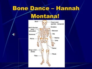 The document summarizes the different types of bones in the human skeletal system, including flat bones that provide protection, short bones found in the wrists and ankles, irregular bones that make up the spine, and long bones that are longer than wide like those in the fingers. It also provides facts about the smallest bone, how many total bones are in the body, where bone marrow is found, and that bones stop growing by age 25.