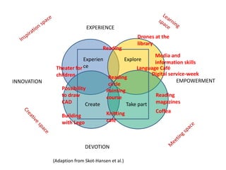 The document outlines various innovative activities and services offered at a library, emphasizing experiences like media skills, digital services, and creative programs such as art and theater for children. It promotes empowerment through engagement in creative explorations and community involvement. Additionally, it highlights flexible spaces for studying and collaboration, such as quiet rooms and maker libraries.